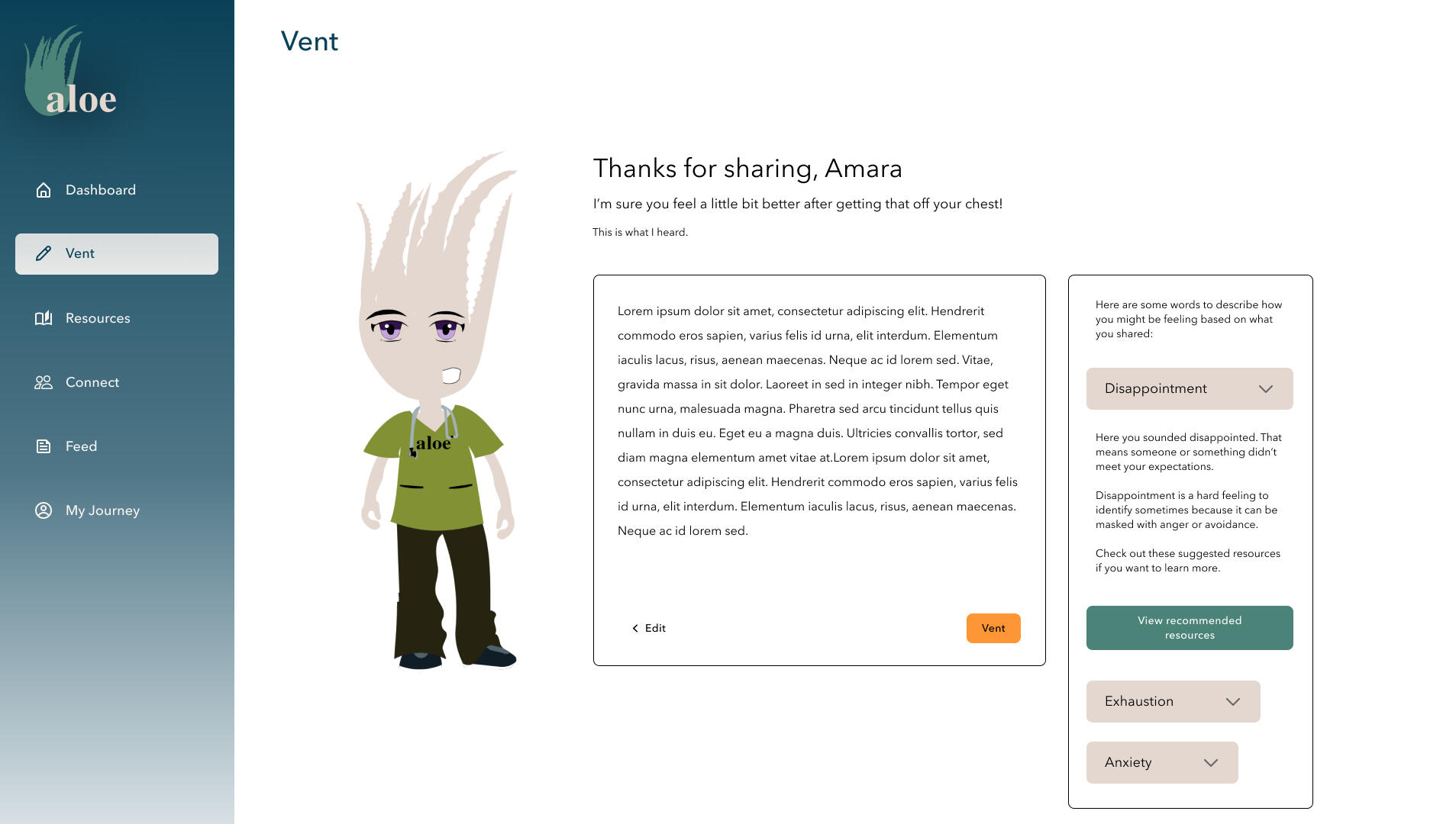 Users heavily noted a desire to discuss problems within their daily lives and institutions without being reprimanded negatively. Therefore, we wanted to ensure anonymity and create a more personal experience by allowing users to customize an avatar named "aloe."