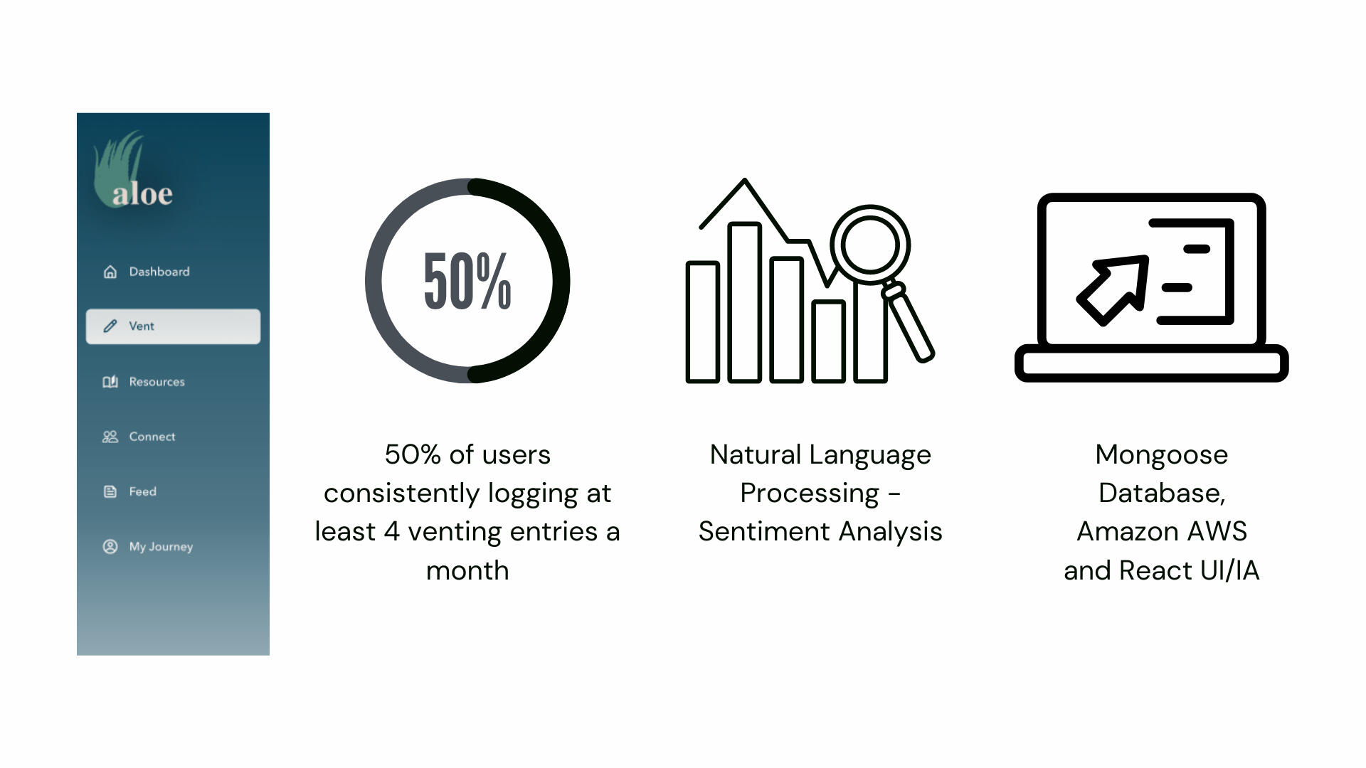 We suggested that through 50% of users logging at least 4 venting entries a month, we could collect enough data to use Natural Language Processing for outlining trends of key emotions and contexts.Utilizing Mongoose Database would allow a wide variety of data points to be related thus, creating more nuanced reporting with endless possibilities for data analysis.Hosting our data on Amazon AWS would secure HIPPA compliance.React would "learn" the needs and trends of users to personalize the experience for them, creating a more comfortable environment for sharing intimate information.