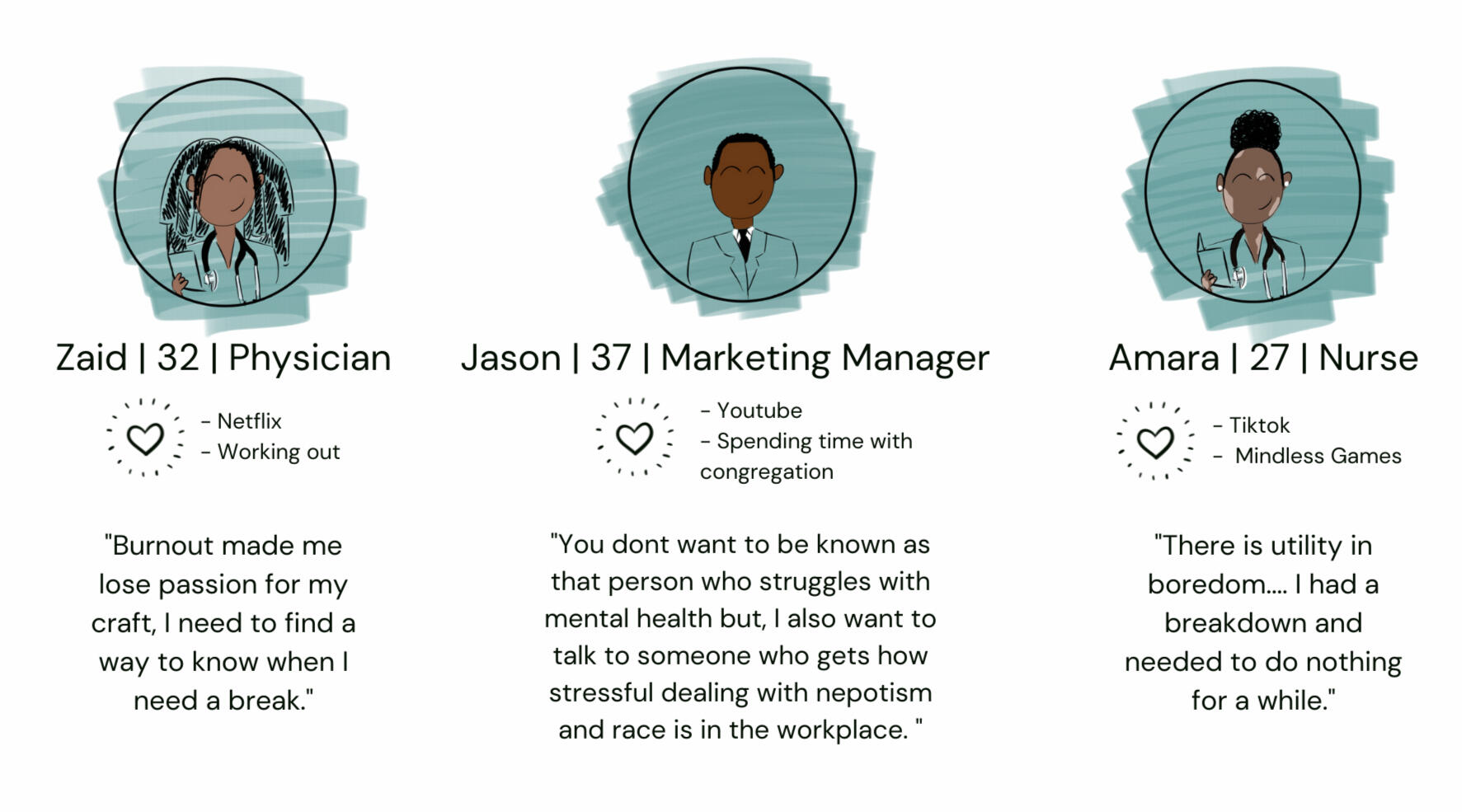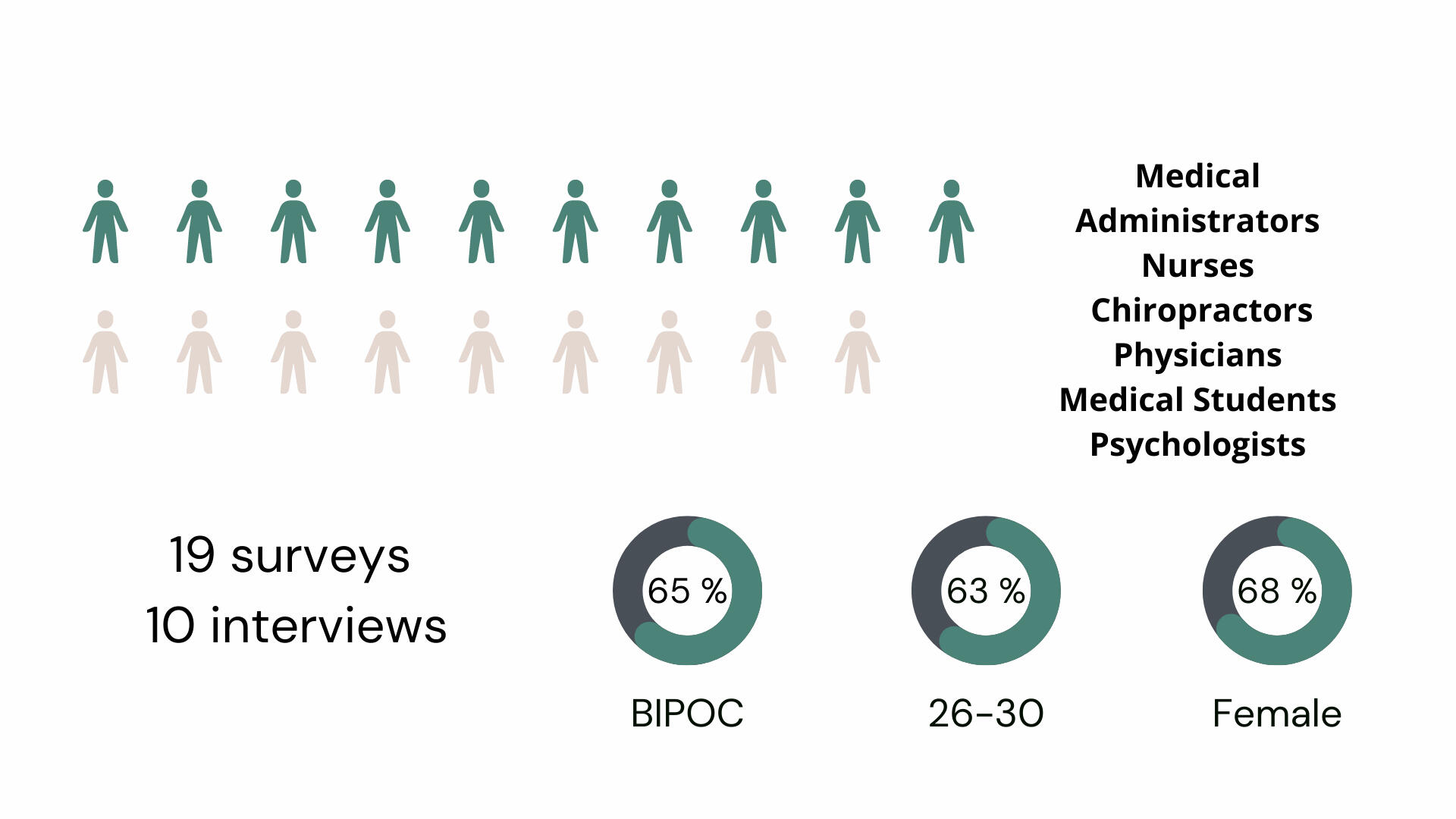 Working with information as sensitive as mental health can be tricky. We wanted to ensure raw and valuable data through prioritizing user's comfort and access to resources.In order to do this, we needed to get detailed information on who our users are and what their pain points were. This is what we found: