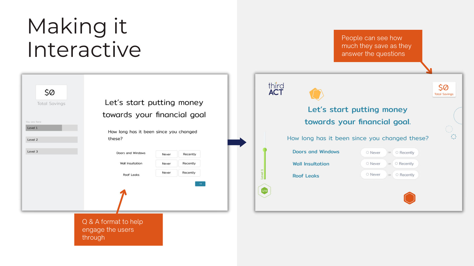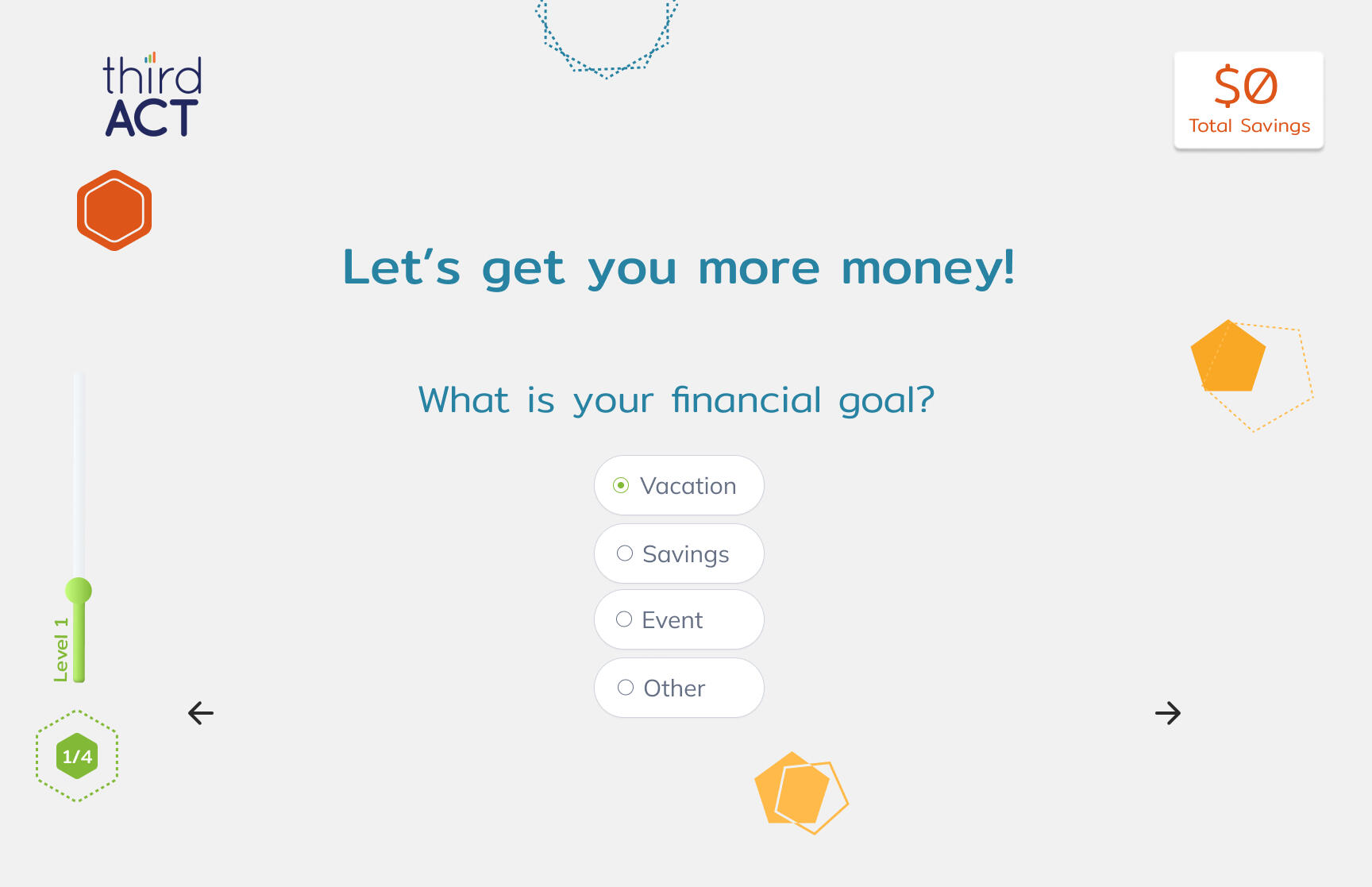 A gamified on-boarding process that educates and excites potential clients on clean energy and energy savings when working with thirdACT, a carbon-zero fintech organization.